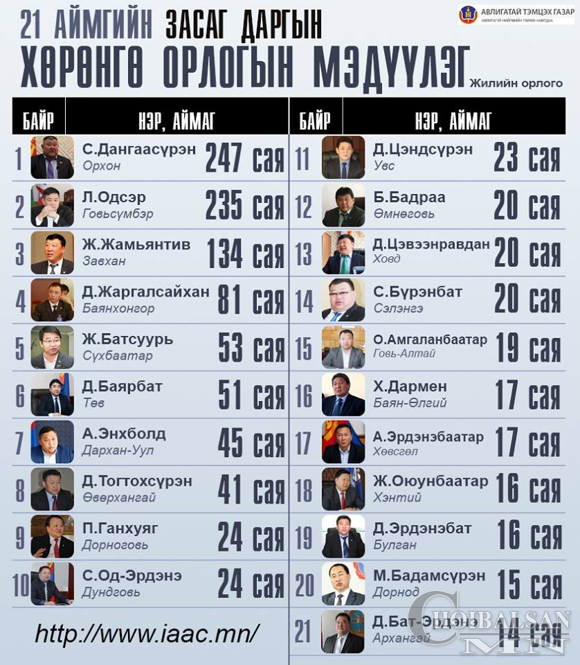 аймгийн Засаг дарга С.Дангаасүрэн жилийн орлогоор тэргүүлж, Говьсүмбэр