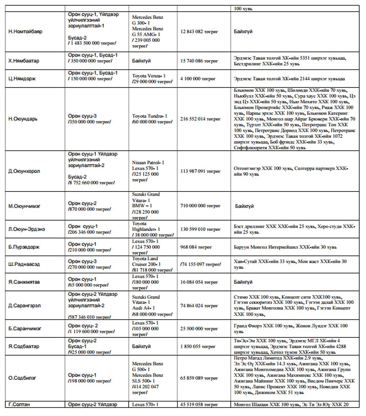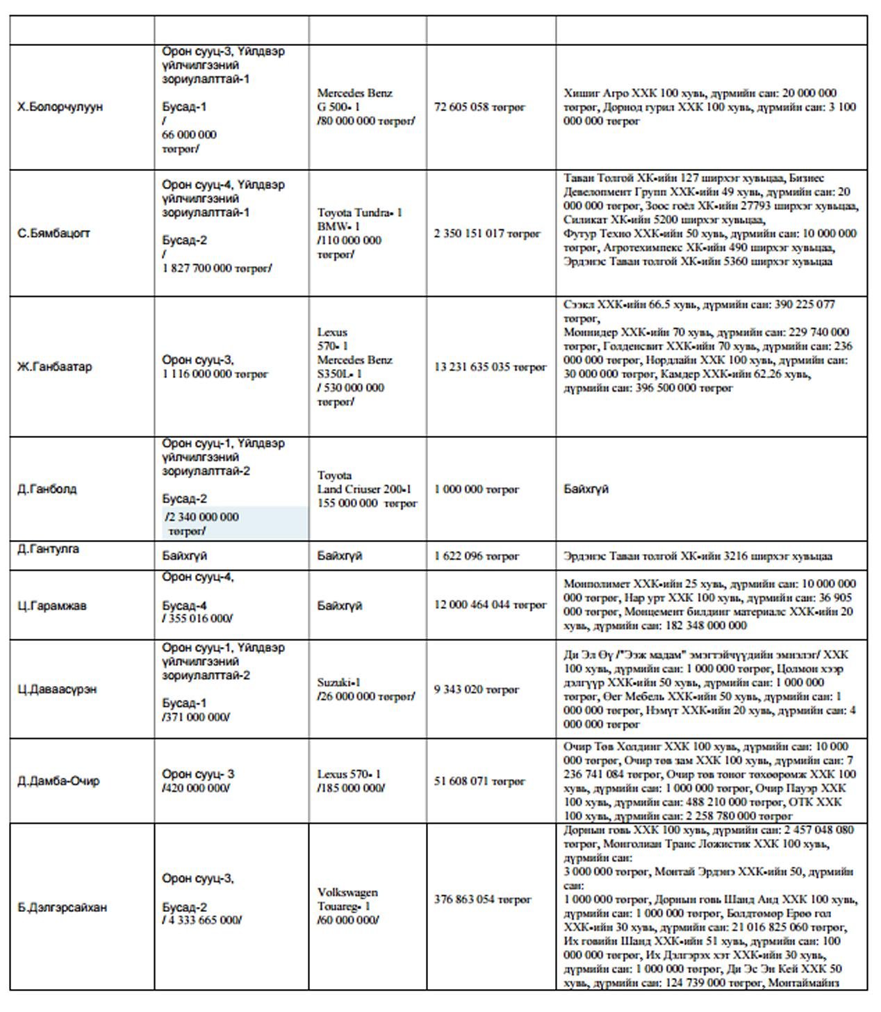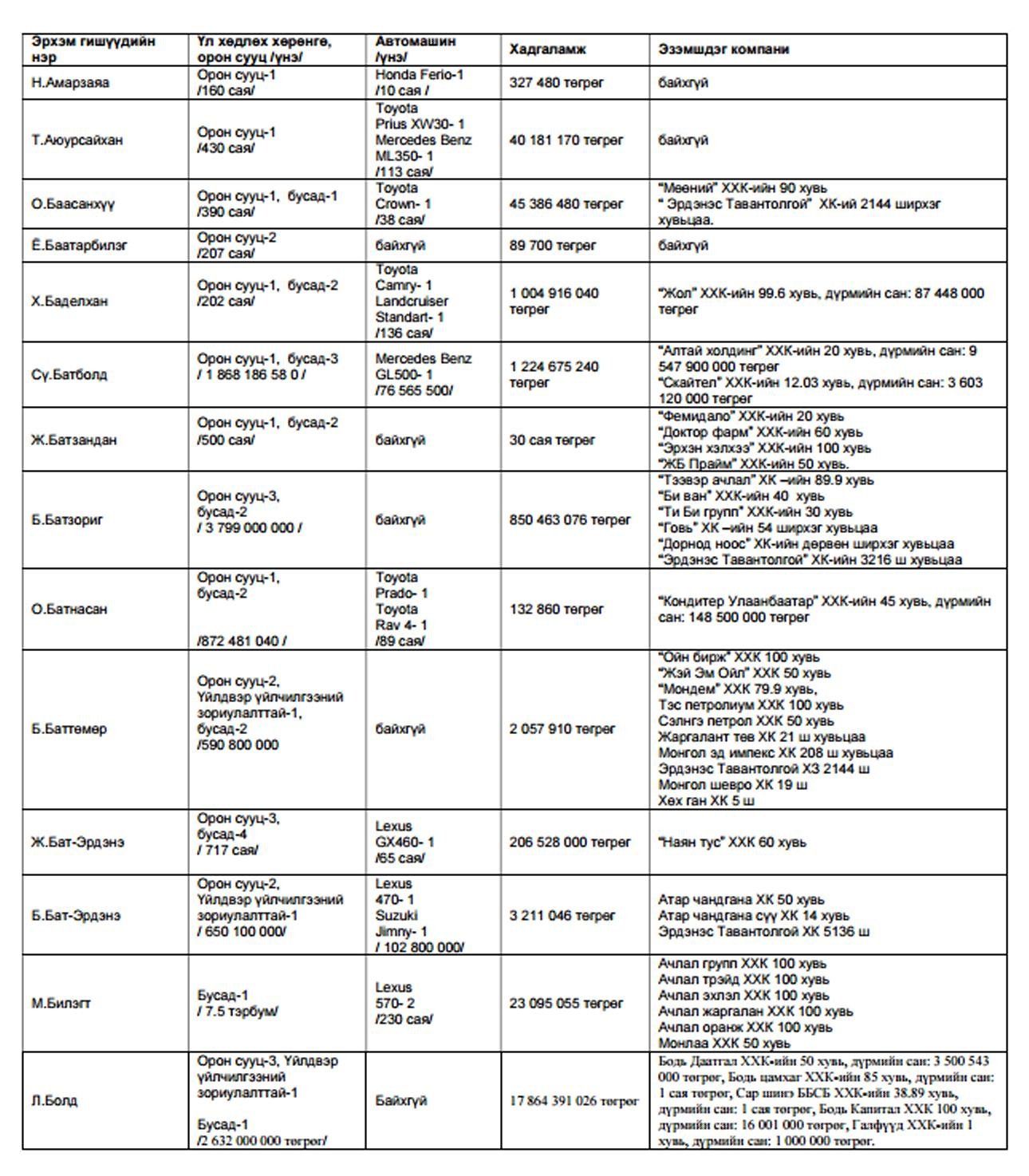 Харин нилээдгүй хэдэн төрийн дарга сайд нар маань өөрийн хувьдаа ма,шингүй хэмээн мэдэгдсэн байх юм. Чухам хэн хэн машингүй болон хөрөнгийн мэдүүлгэтэй нь доорх хүснэгтээс танилцана уу?.