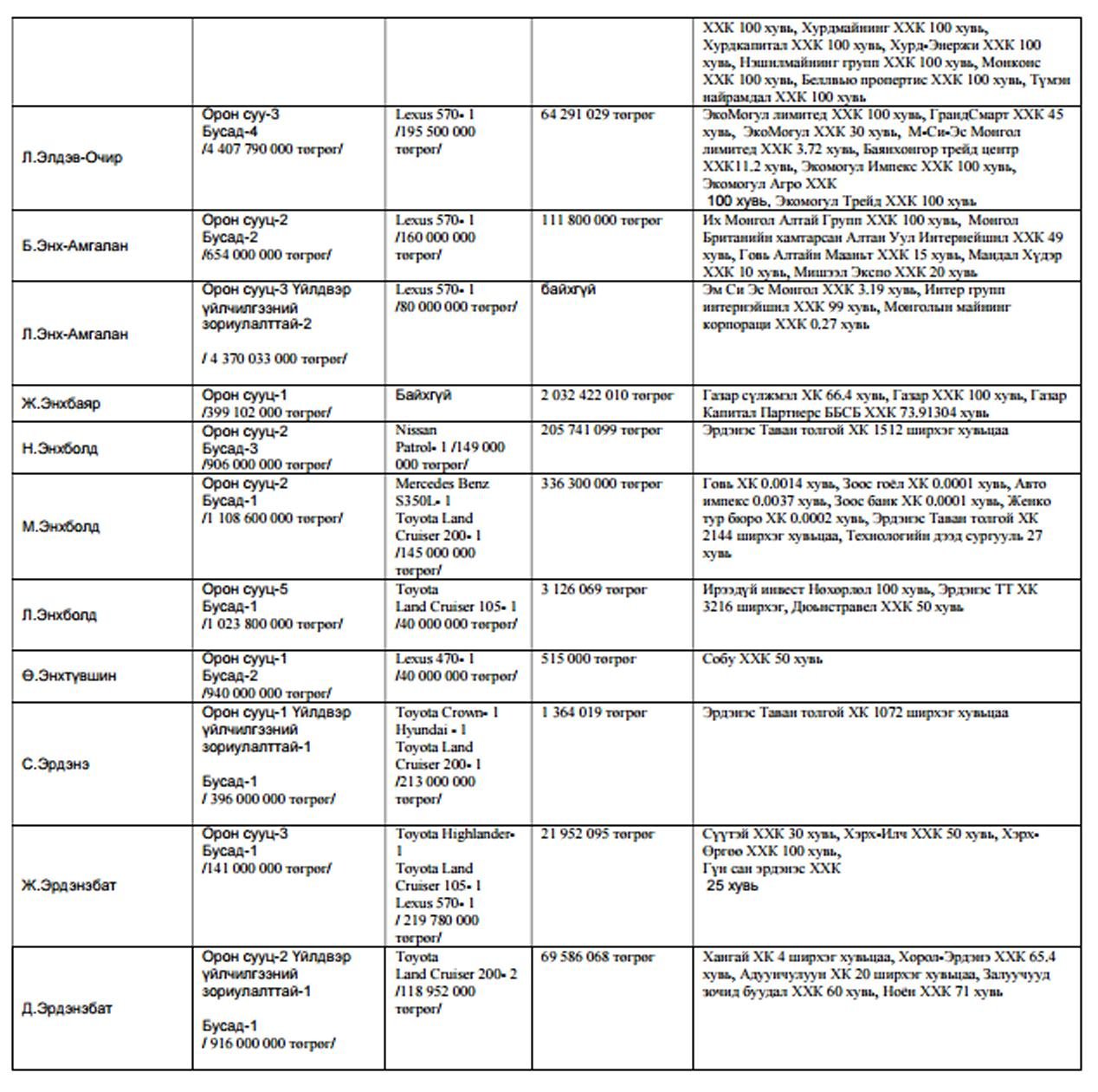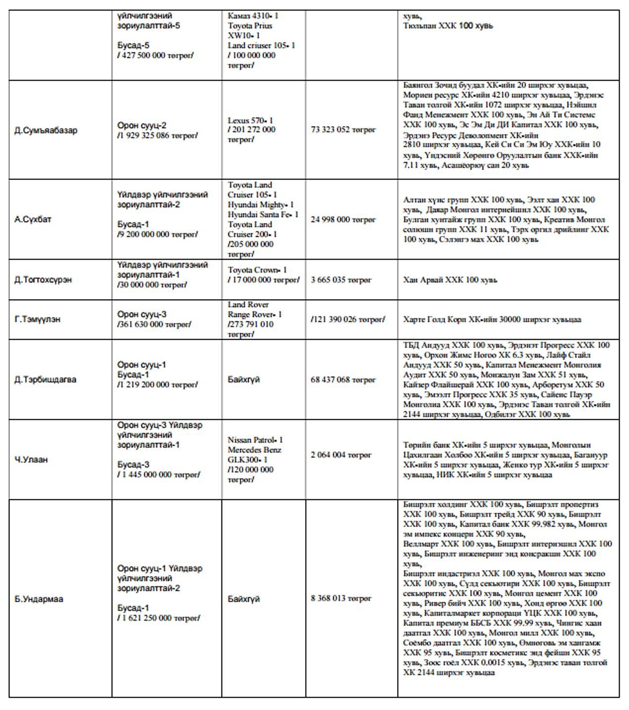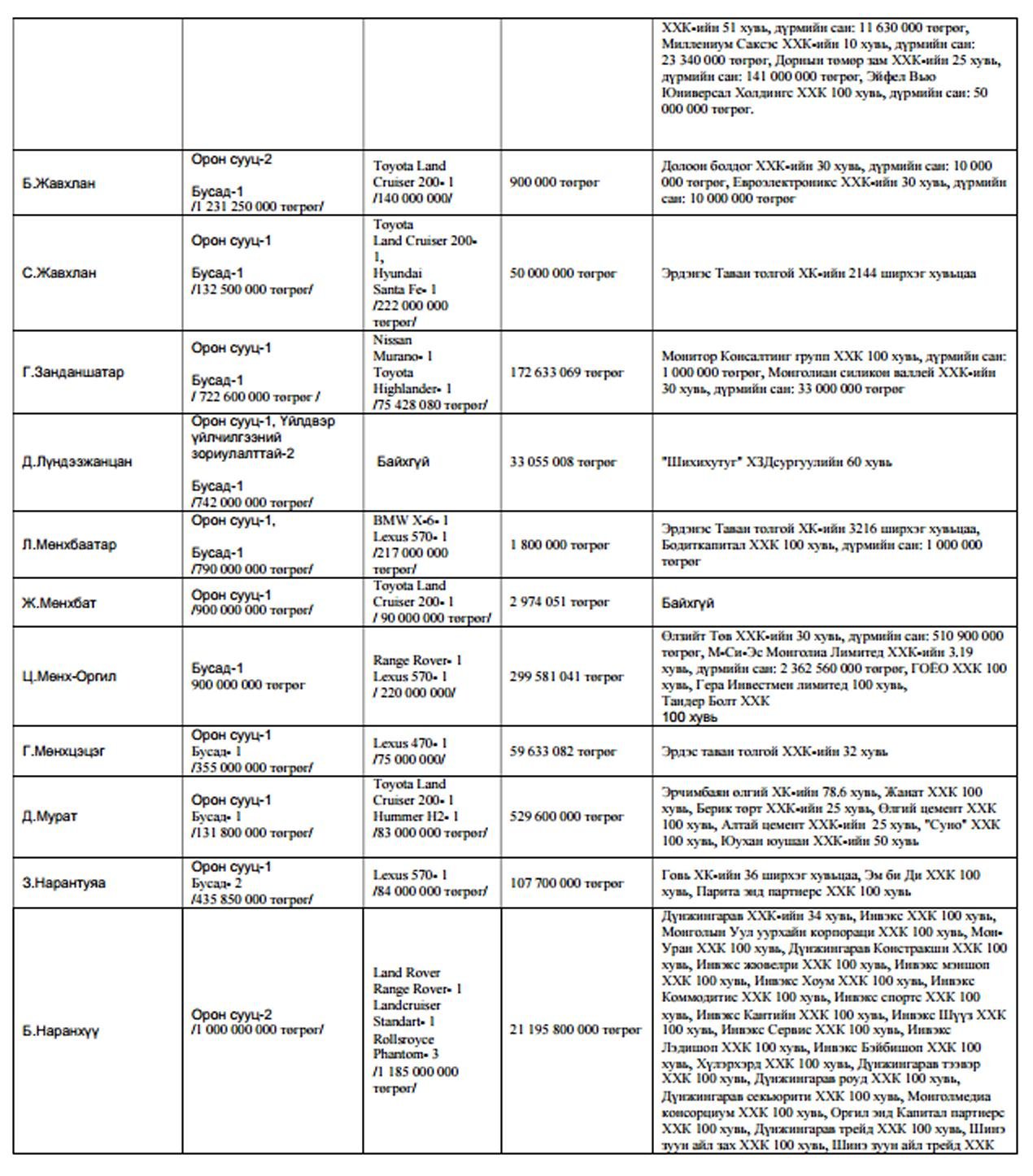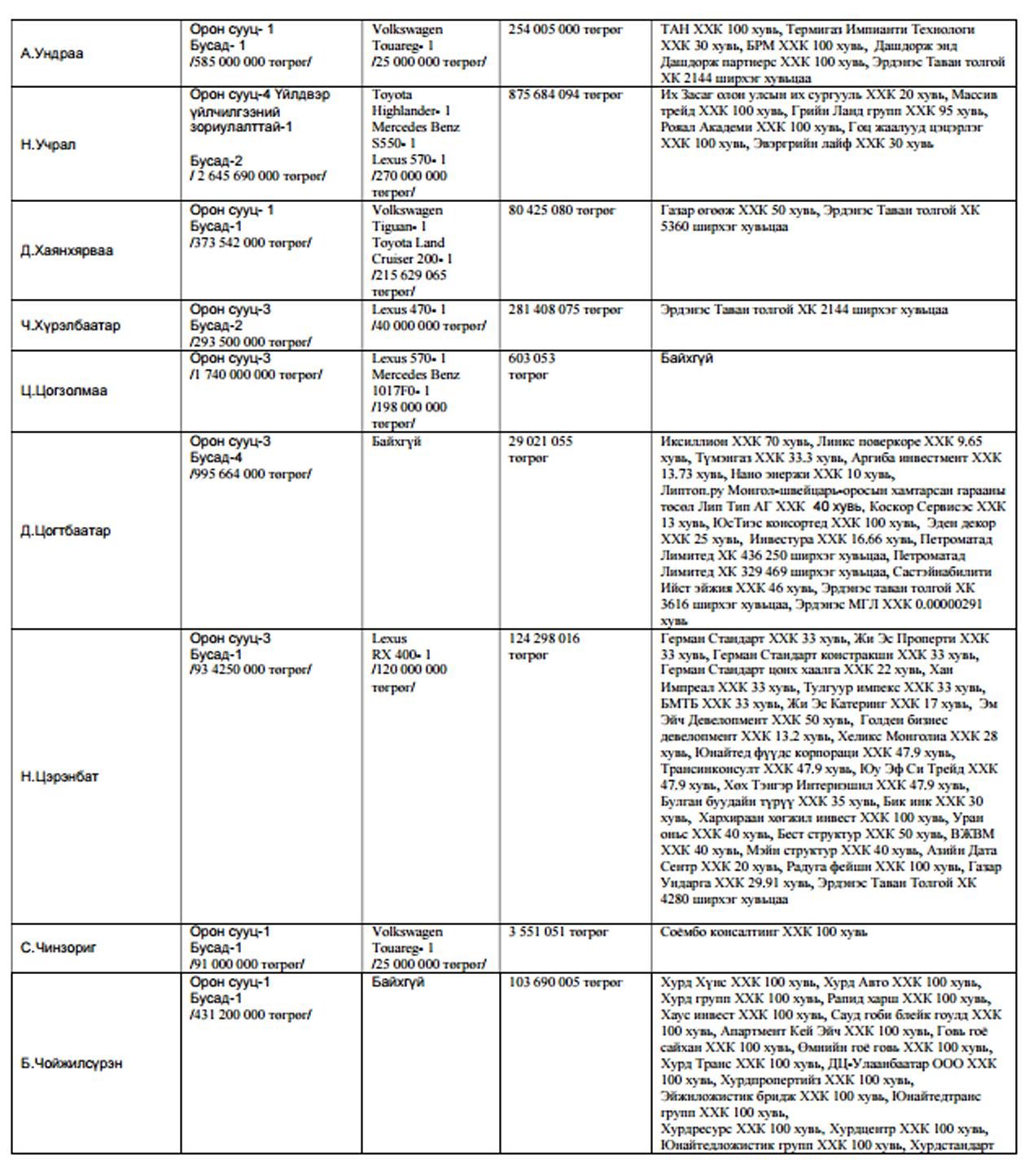 Харин нилээдгүй хэдэн төрийн дарга сайд нар маань өөрийн хувьдаа ма,шингүй хэмээн мэдэгдсэн байх юм. Чухам хэн хэн машингүй болон хөрөнгийн мэдүүлгэтэй нь доорх хүснэгтээс танилцана уу?.