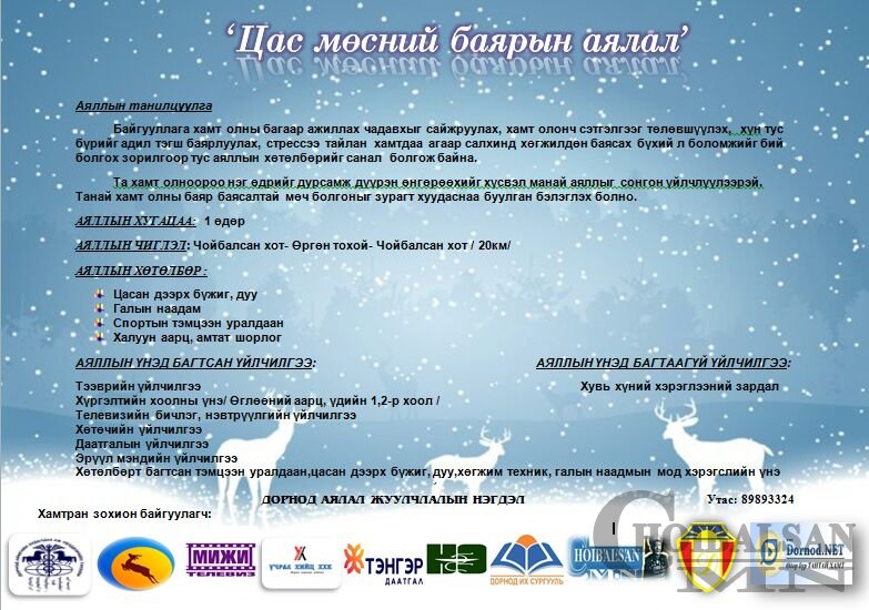 хамт олны "Цас мөсний баяр"-ын аялалын мэдээлэлийг http://www.choibalsan.mn/index.php?newsid=21800 линкээр орж сонирхоно уу.