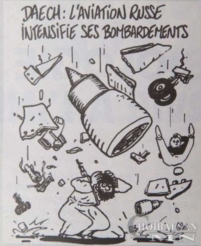 Тус сэтгүүл онгоцны осолтой холбоотой хоёр зураг нийтэлсэн байна. Нүүр хуудаст дээрээс унаж буй онгоцны сэг дор зогсч буй хэт даврагч "Оросууд агаарын дайралтаа эрчимжүүлж байна” гэсэн бол хоёр дахь зурганд ослын газар хэвтэж буй нэг зорчигчийн гавал "Хямдхан нислэг. Аминд минь хүрчихлээ” гэж хэлж буйгаар дүрсэлсэн байна.