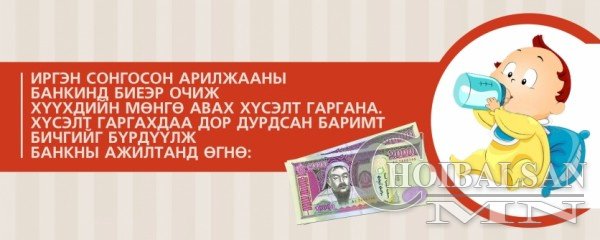 2.18. Иргэн хүүхдийн мөнгийг сар бүрийн 20-ны өдрөөс хойш өөрийн сонгосон арилжааны банкнаас авна.