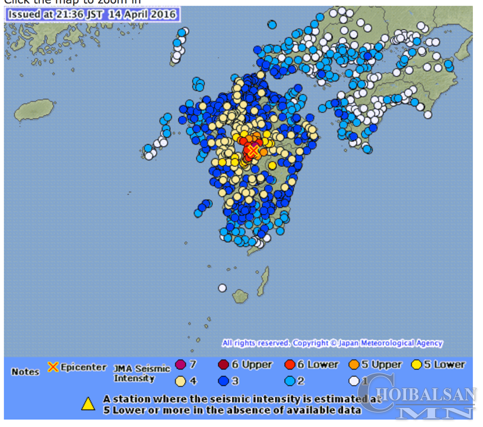Япон улсын өмнөд хэсэг Кюүшюү аралын нутаг тэр дундаа Кумамото хотын орчимд 7 баллын газар хөдлөлт болж багагүй хохирол учирч байна. Уг газар хөдлөлтын улмаас Японы засгийн газраас онц байдал зарлаж Ерөнхий сайд Шинзо Абэ мэдэгдэл хийсэн байна. Тэрээр мэдэгдэлдээ энэхүү газар хөдлөлт үндэсний аюулгүй байдалтай шууд хамааралтай учир бүх талд аюулгүй байдлыг ханган ажиллаж хохирлын хэмжээг тогтоо гэжээ.