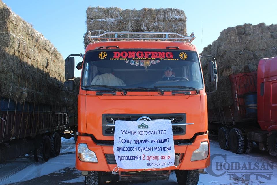 2017 оны 03-р сарын 04-ны өдөр "Манна хөгжил” ТББ-аас зудын хүнд нөхцөл байдалд буй мал бүхий иргэд, малчдад 2 дугаар ээлжийн тусламжаа хүргүүлж байна. 2016 оны 10 дугаар сард аймгийн Засаг даргын орлогч Ч.Ганбат "Манна хөгжил” ТББ-д хүсэлт тавьсны дагуу 2017 оны нэгдүгээр сарын 12-ны өдөр Баян-Уул сумын 180 өрхөд, Цагаан-Овоо, Баяндун, Сэргэлэн сумдын 90 өрх, нийт 270 өрхөд хагас тонн нүүрс, шуудай түлээ, 25 кг гурил, 5 кг цагаан будаа болон өвлийн дулаан куртик хоёр ширхэг, дулаан гутал зэрэг тусламж өрх бүрт үзүүлж байсан бол, энэ удаад Баян-Уул, Баяндун, Цагаан-Овоо, Сэргэлэн сумын 265 өрх, нэг өрх айлд 30 боодол өвсийг буцалтгүй тусламж болгон хүргүүлж байна.