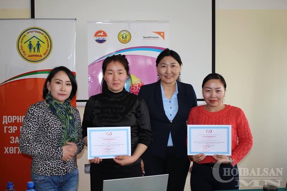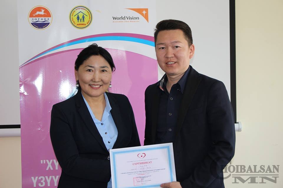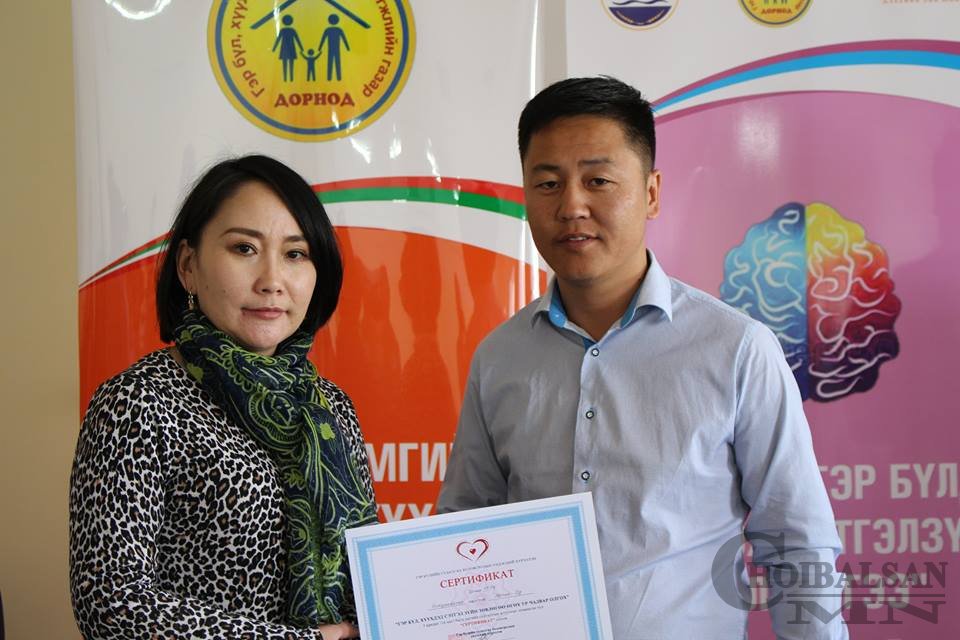 "Хүүхэд, гэр бүлд үзүүлэх сэтгэлзүйн үйлчилгээ" сэдэвт 2 өдрийн сургалт амжилттай болж өндөрлөлөө. Тус сургалтанд сум багийн нийгмийн ажилтнууд, Дорнод аймгийн мэргэжлийн сэтгэлзүйчид нийт 57 хүн хамрагдлаа. Сургалтыг гэр бүлийн судалгаа боловсролын үндэсний хүрээлэнгийн захирал, ОУУБИС-ын гэр бүл судлалын тэнхимийн эрхлэгч Б.Оюун-Эрдэнэ удирдан явууллаа.