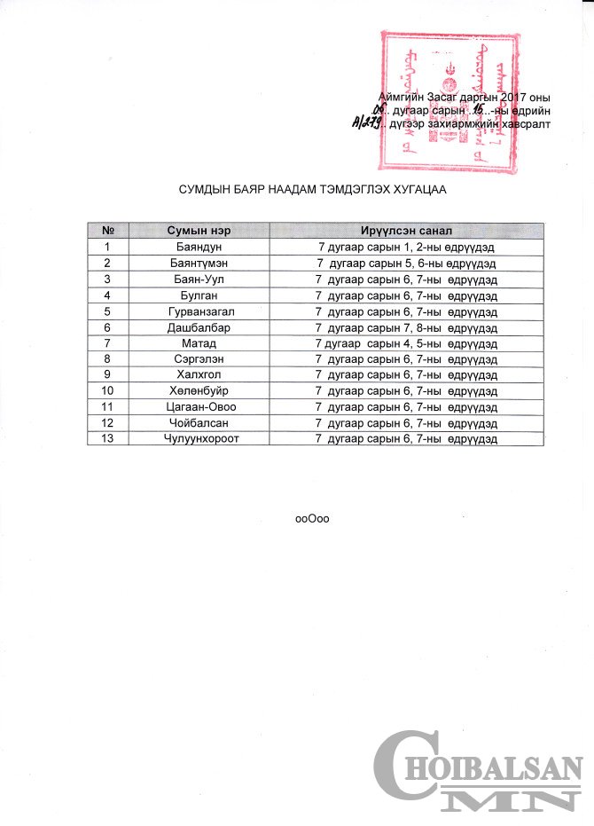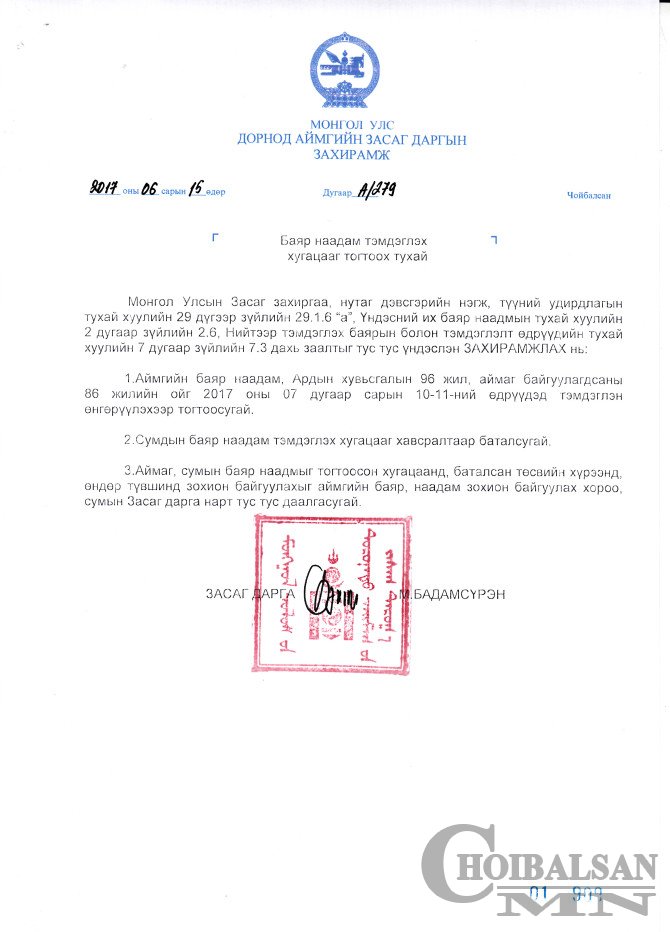 Үндэсний их баяр наадам тэмдэглэн өнгөрүүлэхтэй холбогдуулан аймгийн Засаг даргын 2017 оны 06 дугаар сарын 15-ны өдрийн "Баяр наадам тэмдэглэх хугацааг тогтоох тухай” А/279 дүгээр захирамж гарлаа. Аймгийн баяр наадам, Ардын хувьсгалын 96 жил, аймаг байгуулагдсаны 86 жилийн ойг 2017 оны 07 дугаар сарын 10-11-ний өдрүүдэд тэмдэглэн өнгөрүүлэх юм. Харин сумдаас ирүүлсэн саналыг үндэслэн сумдын баяр наадмын товыг аймгийн Засаг дарга захирамжаар дараах хуваарийн дагуу баталсан.