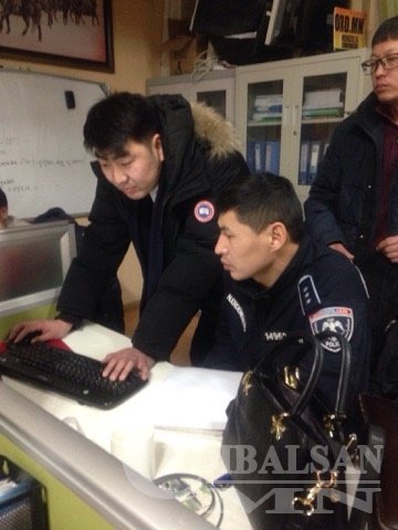 Сэтгүүлчийн компьютерийг Сод Монгол группийн хуулийн багийнхан гэх этгээдүүд хорооны цагдаагаар далайлган шалгаж байгаа байдал