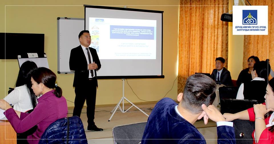 ЗГ-ын хэрэгжүүлэгч агентлаг Гэр бүл, хүүхэд, залуучуудын хөгжлийн газрын Гэр бүлийн газрын дарга Н.Өлзийхутаг Засгийн газрын хэрэгжүүлэгч агентлаг Гэр бүлийн хөгжлийн газраас 2018 онд хэрэгжүүлж буй арга хэмжээ, орон нутагт хүргүүлсэн чиглэл, 2019 оны төлөвлөлтөд тусгах саналуудыг сонсож, мэргэжил, арга зүйн зөвлөгөө, мэдээллийг хүргэлээ.