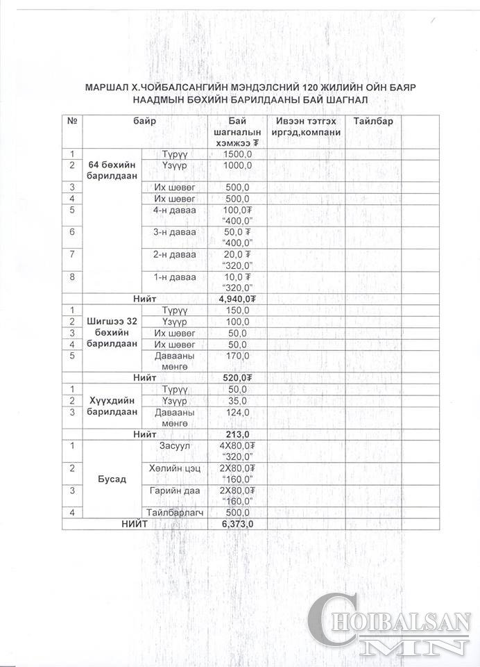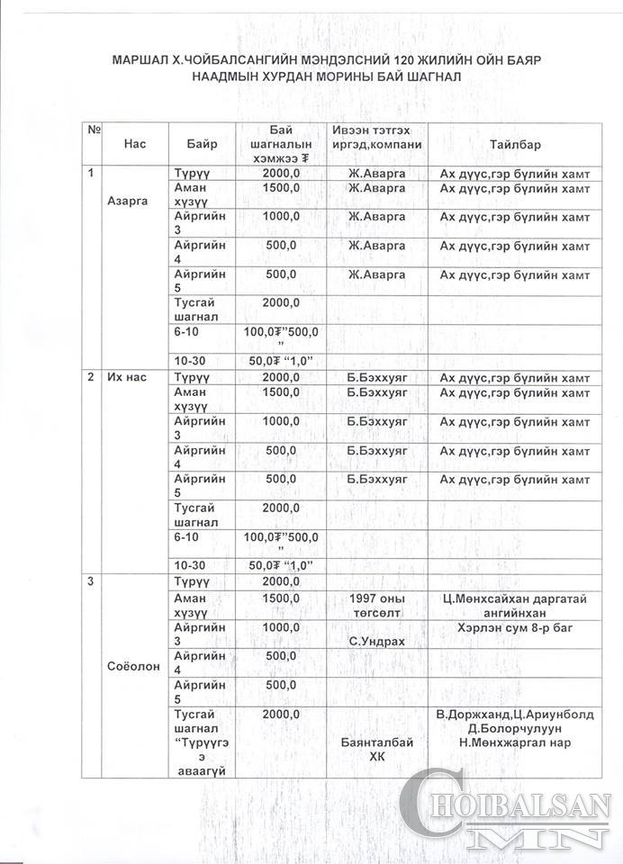 Маршал Х.Чойбалсангийн мэндэлсний 120 жилийн ойн баяр наадмын морь, бөх, сур, шагайн харвааны бай шагнал баяр наадмын хүүхдийн бөхийн бай шангналыг Б.Жамъянсанжаа гэр бүлийн хамт ивээн тэтгэхээр боллоо