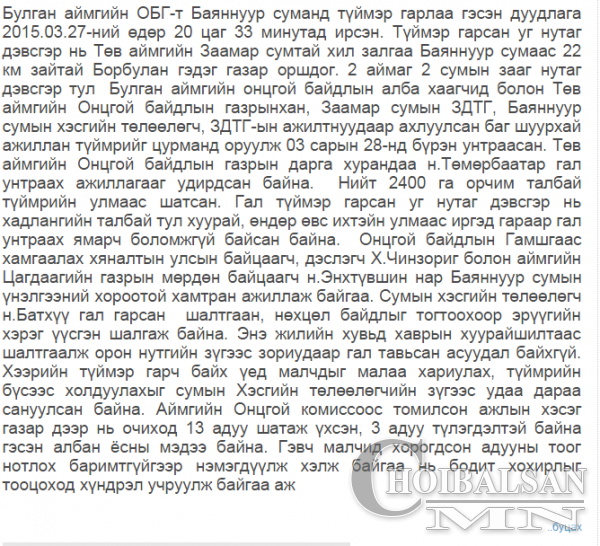 Хэдхэн хоногийн өмнө Булган аймгийн Баяннуур суманд гал түймэр гарч нэр бүхий 2 малчин өрхийн 2 азарга адуу болох 52 тооны адуу гал түймэрт өртөн шатаж үхсэн байдаг. Харамсалтай нь тухайн гал түймрийг гарахад орон нутгийн удирдлагууд байсангүй. Үнэндээ тэд бөөнөөрөө ажил тасласан гэж хэлж болох. Баяннуур сумын Засаг дарга Б.Алтаншагай гэх эрхэм сумын ИТХ-ын дарга С.Насанжаргал тэргүүтэй 22 ажилтнаа авч зохион байгуулалттайгаар 3 сарын 26-ны пүрэв гарагын ажлын өдөр Улаанбаатар хотод авч ирж хамтдаа ууж идэж наргисан бололтой байдаг. Үүний араар нь суманд нь гал түймэр гарч 52 адуу амьдаараа шатаж үхжээ. Б.Алтаншагай дарга 6 сая төгрөгийн өртөгтэй онцгой байдалд хэрэглэх ёстой дуут дохио бүхий чанга яригчаа ажиллуулж , хэргийг нь гаргаж амжилгүйгээр олон адууг "нүд аниулжээ”.